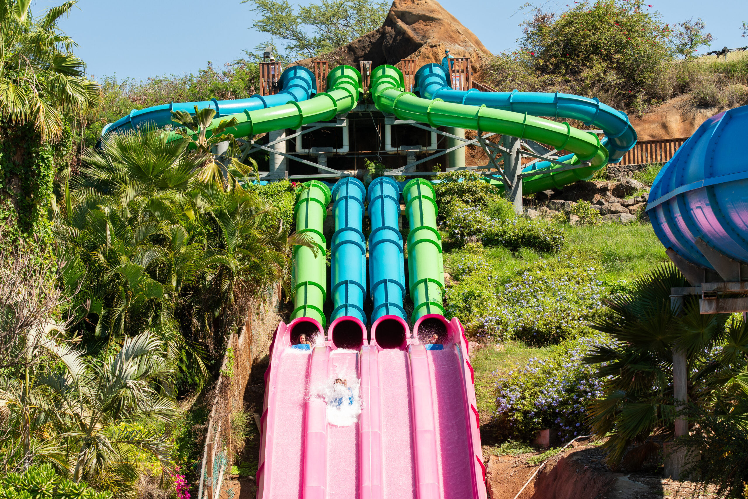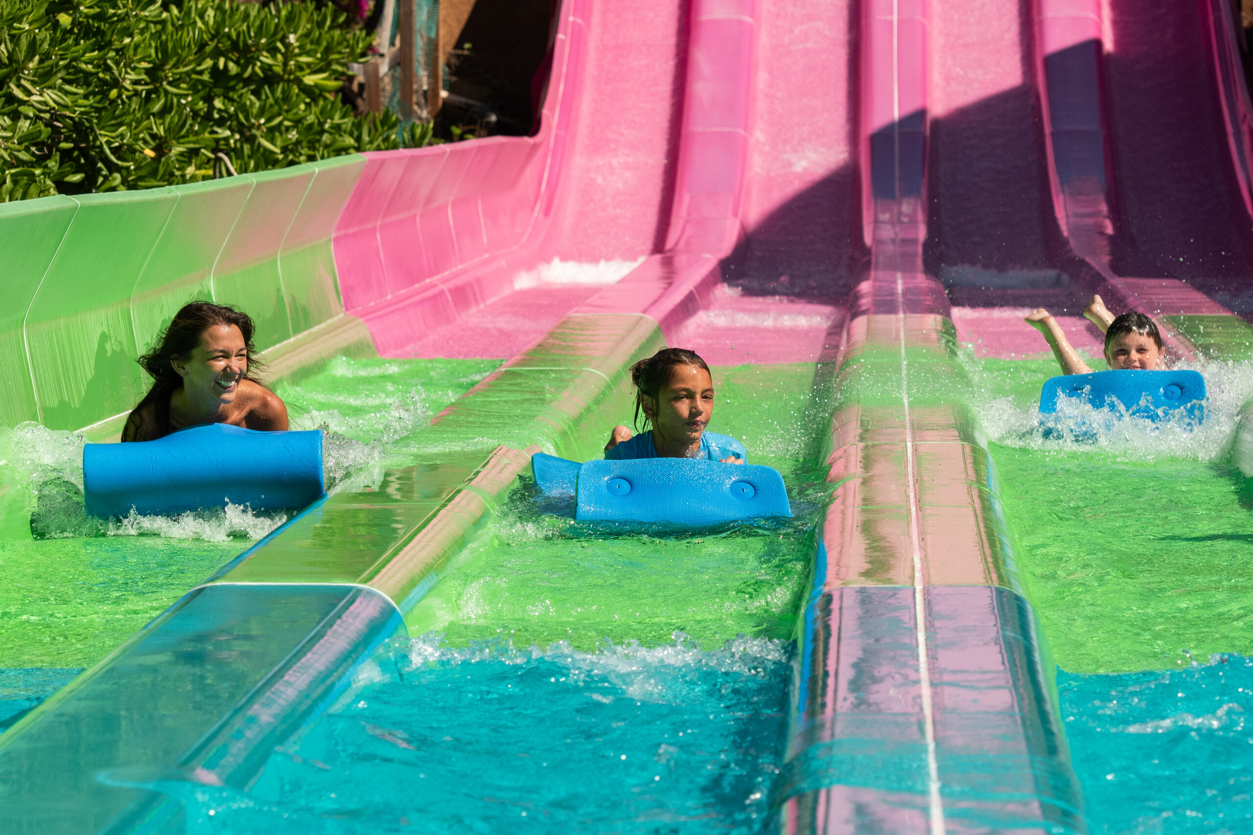 The next generation of racing slides. Four stories high and nestled along the natural cliffs, the Volcano Express takes guests head-first on a racing mat into an enclosed tube, then loops them into a four-lane downhill speedway. Riders accept the challenge to determine who is the fastest as they race their family and friends side-by-side on this exhilarating voyage.