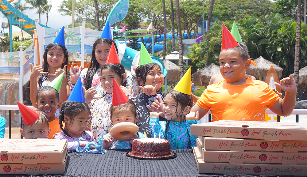 NOTE: The park offers two birthday party areas: the Main Birthday Hut, located near the kids’ play areas, and the Wavepool Party Pad, overlooking the Hawaiian Waters Wavepool/\.